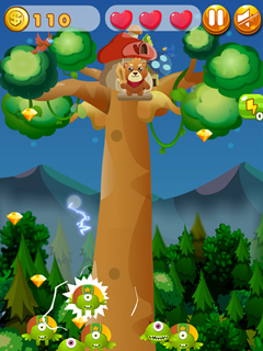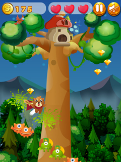 Help the cute Squirrel Hero to defend their tree against strange alien creatures that come floating through the air and attack the squirrels home. The bravest of the squirrels fight the aliens be jumping at their heads from above and prevent them from passing the tree house.In 25 exciting levels you fight a rearguard battle as more and more creatures attack and the squirrels have to climb higher and higher into the treetops. The higher you get, the cooler extras you will find and the more power-ups you are able to afford. Freeze your enemies, slow them down or even throw bombs at them. Kaboom!